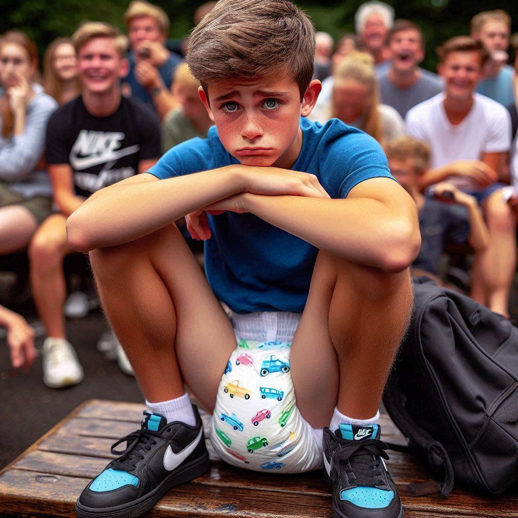 Parmi les sujets préférés des mouilleurs de couches, l’internat à une place privilégiée. Pour certains, c’est le souvenirs d’années douloureuses faites d’humiliations, de quolibets, de moqueries. Des humiliations vécues ou par procuration qui marqueront à jamais ces personnes. Voir un de ses camarades de classe au réveil se faire moquer par tous les élèves car il porte encore des couches et que son lit et protégé par un épaisse alèse en plastique. Ou bien vivre soit même cette humiliation sans pouvoir cacher sa situation. Beaucoup de témoignages d’anciens élèves dans les années 60 à 80 donnent une description assez précise de ces moments délicats. Bien évidemment, aucune image n’existe. C’était sans compte sur l’IA, l’intelligence artificielle. Je dois avouer que ce ne fut pas une sinecure. Comme me le rapportait Thomas de CS Artwork, il faut penser comme un américain. A la fois pudique, puritain et très à cheval sur les mots choisis. Même en utilisant un vocabulaire adapté pour ne pas tomber dans la censure pure et dure, les images générées m’ont demandé pas mal de temps. Voici quelques unes de ces images en preview. La série complète est à découvrir ICI.